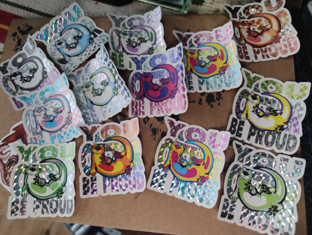 Last year I designed these pride flag designs. I initially wanted to get them all printed onto t-shirts – but couldn’t afford the overhead costs. But following the success of attending and selling at my first convention since May 2019 (!!!), and after getting inspired by the holographic stickers that I saw there and on TikTok recently. I decided to get them printed as holographic stickers.